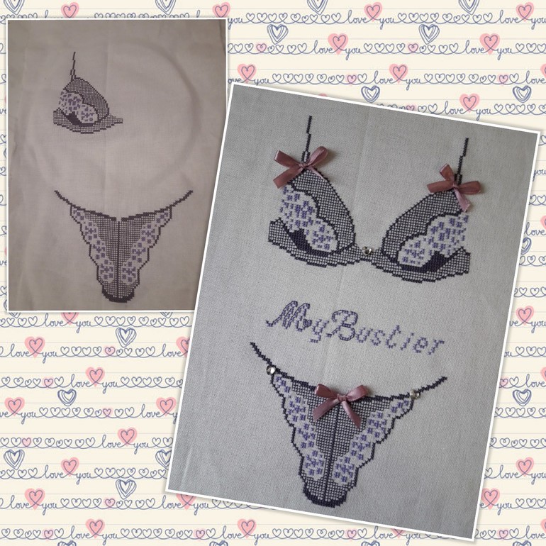 Но, вышила комплект белья. Заказала рамку. Это будет маленький подарок в честь открытия магазина нижнего белья..Вот примерно так