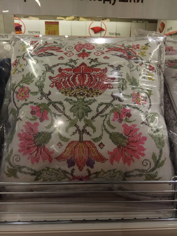 Зашли в Домовой. Я купила рамку для вышивки и подушку. Наволочку пока не сшила, мне нужна подходящая ткань. А петух уже готов.