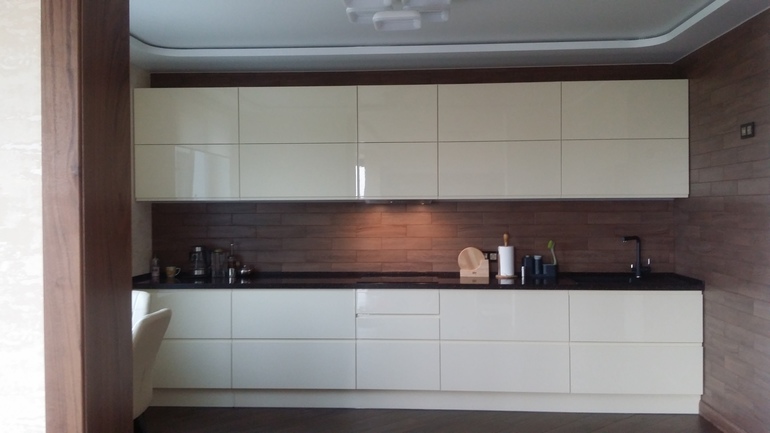 Площадь то ли 12 то ли 14 я не знаю, мы делали перепланировку и соединили с залом. Изначально хотели чтобы было много шкафов, чтобы вся утварь поместилась и чтобы все можно было спрятать внутрь, а не стояло на столешнице. Угловую кухню я не захотела, тк тогда пришлось бы стоять спиной к окну, а мне хотелось чтобы было максимум света. Цветовую гамму предложила я, также я всегда мечтала темную столешницу, в итоге выбрали бежево-молочные фасады с перламутровыми переливами и антрацитовую столешницу с золотыми вкраплениями. Не думала, что муж согласится на эти блестки, а муж поддержал. Зато он предложил делать симметрии и все без ручек, а шкафы открываются наверх, я долго сомневалась, как-то я не привыкла к таким новинкам, хотелось по-старинке, с ручками. Но доверилась мужу и действительно ручки- они же пазы - очень удобны. И протирать фасады от пятен легко. Вместилось в шкафы все и еще много пустого ))