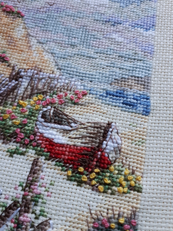 Вышивался этот набор долго и сложно. Вроде бы и маленький, но очень много цветов. Сложение нитей разное, плюс блэнды и очень много полукреста( это плюс). Сделала огромную ошибку,которую заметила только после того, как отшила почти весь сюжет. Вместо креста вышила всё полукрестом.
