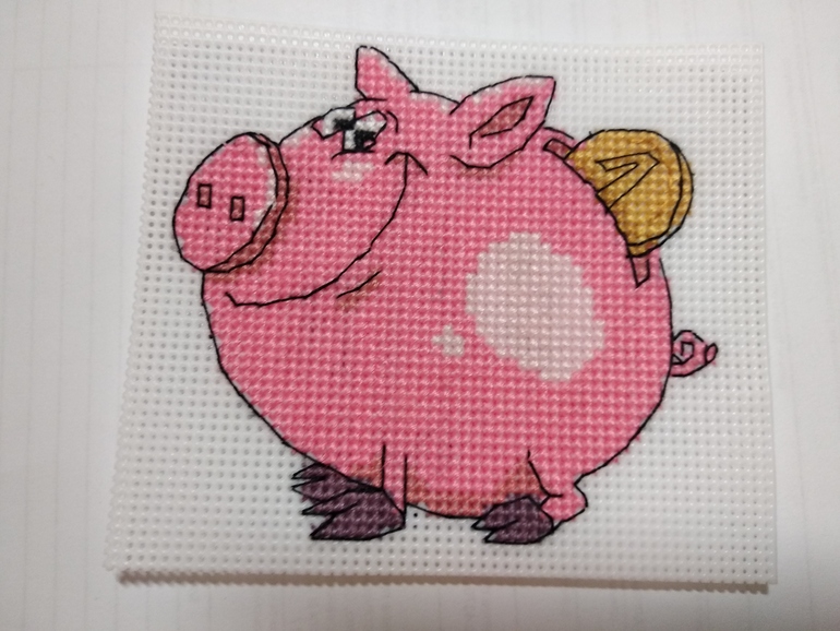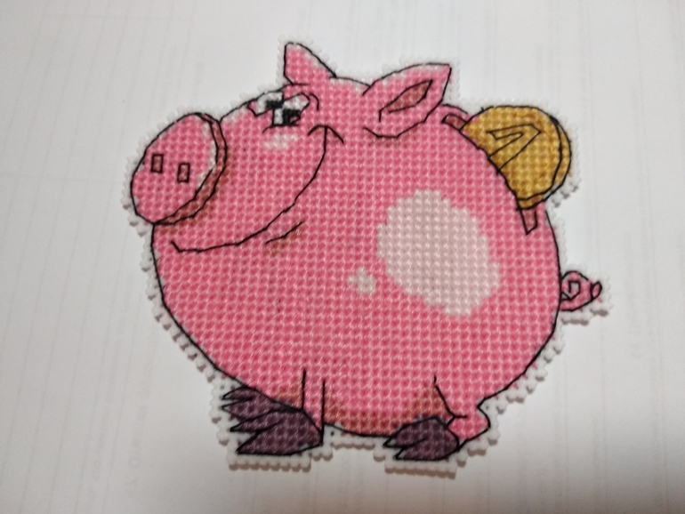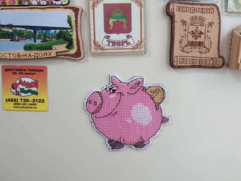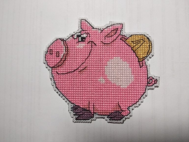 Это мой первый опыт вышивки этой фирмы и на пластиковой канве. В набор входят пластиковая канва, нитки 8 цветов (ПНК им. Кирова, бррррр, ужасно не понравились), игла, схема и магнитный лист. Так поросенок выглядел после вышивки