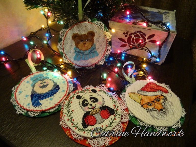 Игрушки вышивала ещё в прошлом году и только в этом году руки дошли до оформления. К сожалению изнанку не покажу, т.к. не фотографировала, а игрушки уже отправились в качестве небольшого новогоднего презента. С изнанки там ткань хлопок. Могу в ВК скинуть МК на такой пинкип. Все не так страшно, как кажется на первый взгляд)))) я с первой игрушкой провозилась, а остальные уже быстрее получились.
