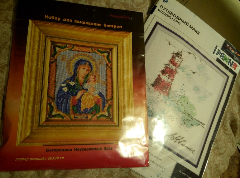 По теме недели. Этот год для меня - год, в который я закончила все свои долгострои. И занялась оформлением работ, которые мирно лежали в шкафу. Мои запасы скромны: икону подарил супруг, а маяк я выйграла в конкурсе репостов ещё в прошлом году. Стараюсь ничего не приобретать, а доделать начатое и вышить эти два набора.