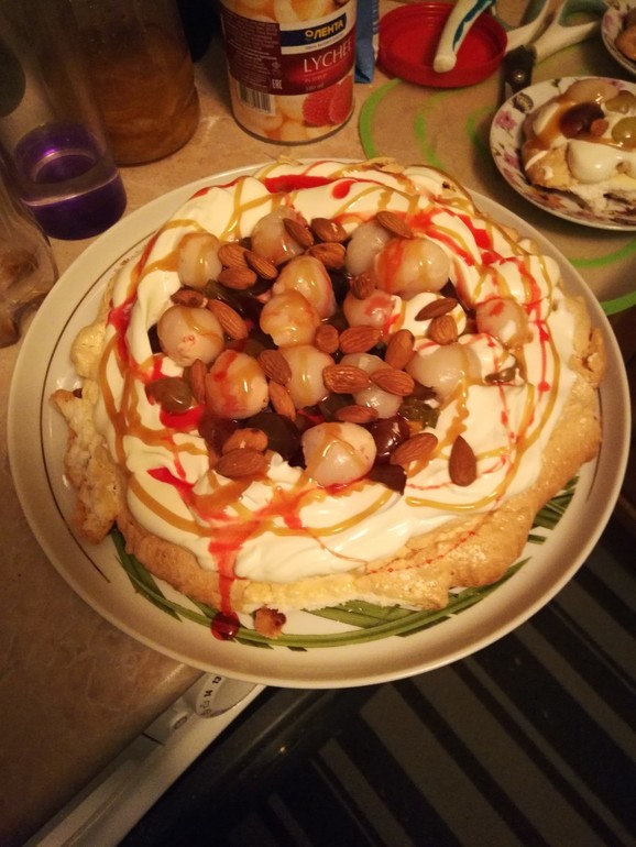Еще на неделе поддалась соблазну и спекла торт Павлова - на работу. Все коллеги были в восторге) и я конечно тоже. Классических ягод у меня не было, так что сделала его с виноградом, личи и миндалем. Очень вкусно!