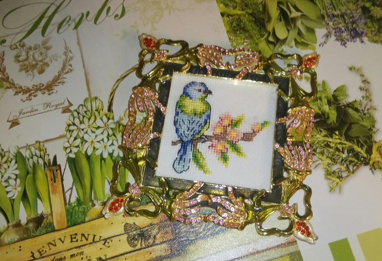 Была у меня рамка красивая, подружка отдала. Нашла схемку птички в книге и вот что получилось.