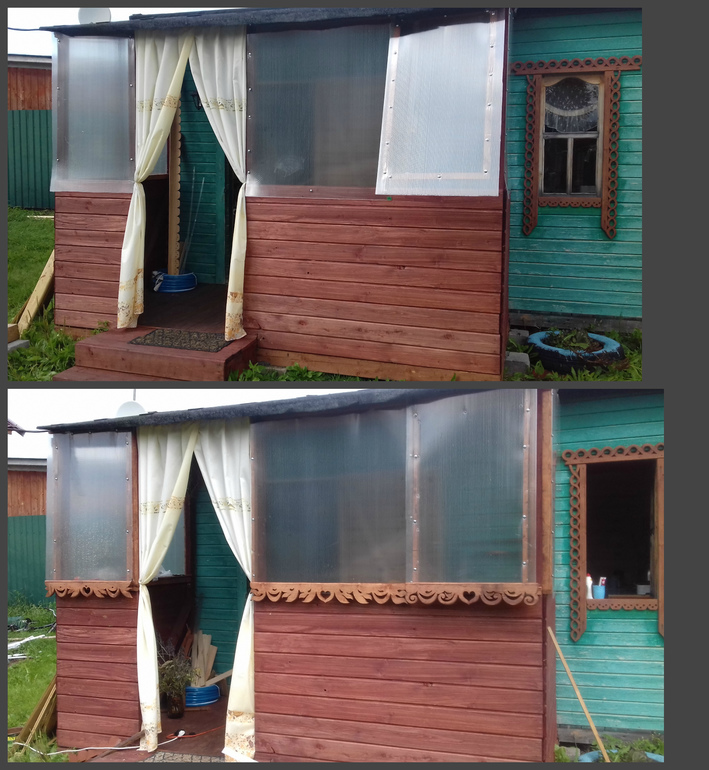 Собственно, доделала я поликарбонатные окна у маленькой веранды - теперь там два окна, слева от входа и справа у угла, есть подоконники изнутри - и начала ее отделку. Планируются наличники по периметру - на сегодняшний день готов низ(фото наверху - до переделки, как говорится, найдите семь отличий))):