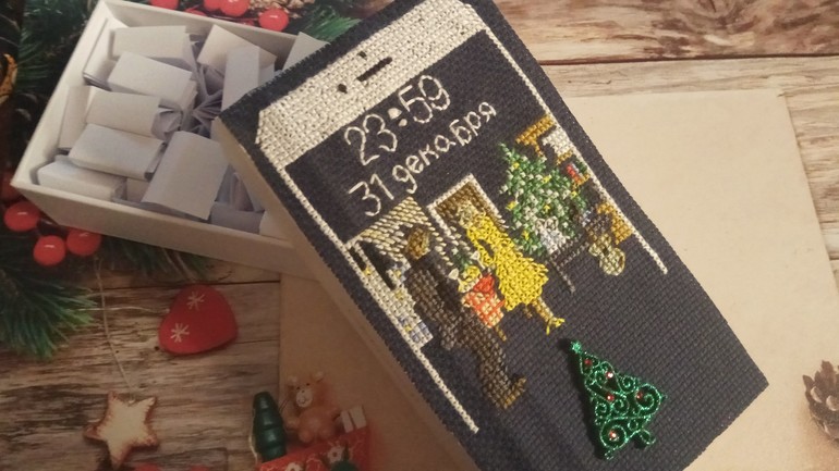 А вышивку приклеила просто на двухсторонний скотч, уже делала так. Пока в этой коробочке фильмы, которые хочу посмотреть перед новым годом, в каникулы, чтобы зарядиться новогодней суматохой))) а потом уже буду новогоднюю мелочёвку буду хранить