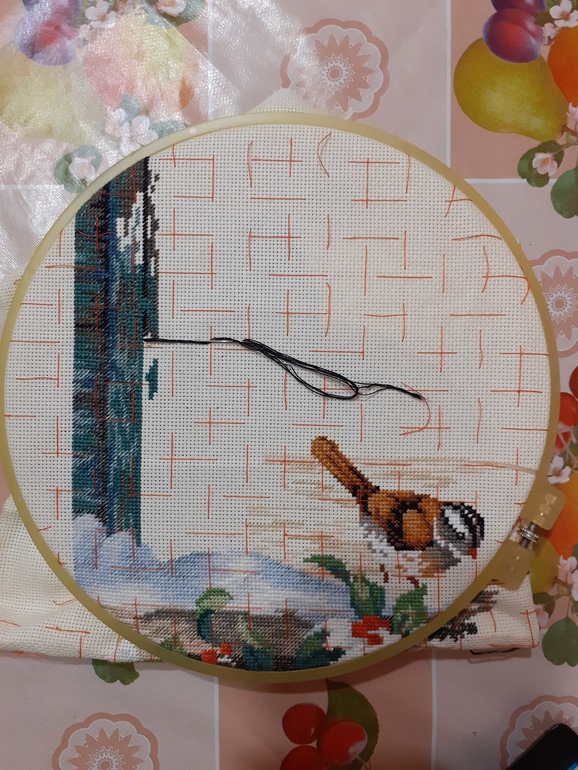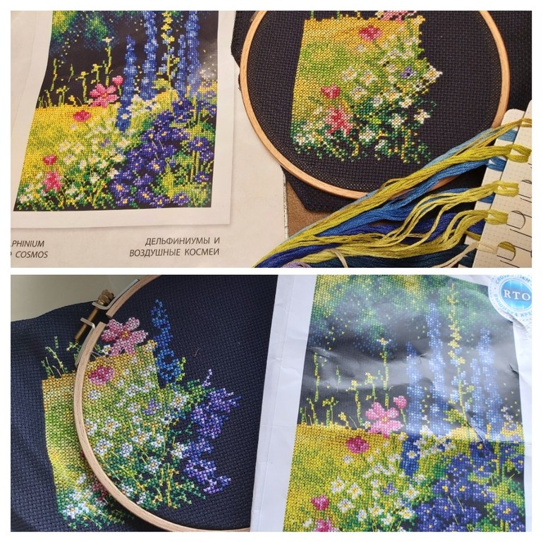 Цветы на белой равномерке уже поднадоели и я с большим удовольствием переключилась на пусть черную, но крупную 14 аиду. Да и одиночек здесь меньше, правда свои трудности. Зашив неполный, поэтому важно не пропустить отдельные клеточки, спасает яркий маркер, отмечаю им, что вышила.