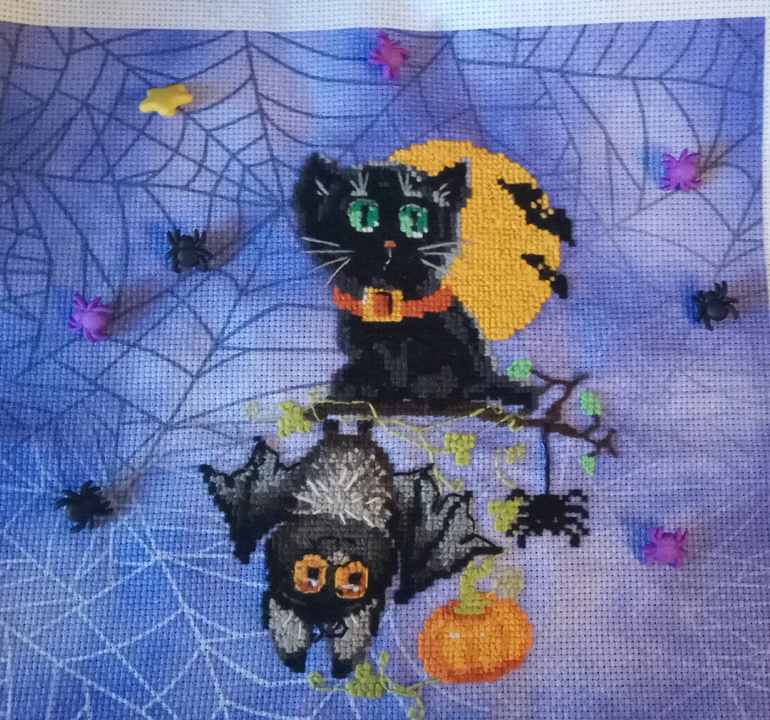 А повышивала, как всегда, отлично ) Сюжет с котенком и летучей мышкой просто загляденье! А фон тоже вышит или это канва такого цвета интересного?