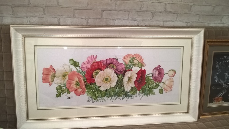 Маки очень элегантны, а вышивка с чаепитием очень преобразилась в раме. Когдя я ее у тебя без оформления видела,то она не произвела такого впечатления как сейчас. Сейчас прям оочень нравивится мне. Ну и сапожок быстро растет. Хорошо тебе, на работе вышиваешь)))