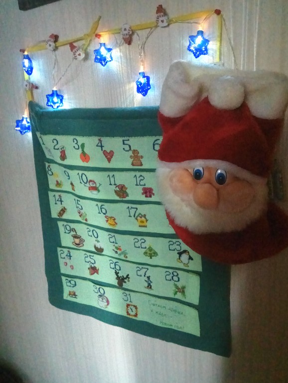 Календарь будет такой же как в прошлом году, вышитый. В кармашках будет по 4 пакетика чая, каждый день разный. А в носке вкусняшки)