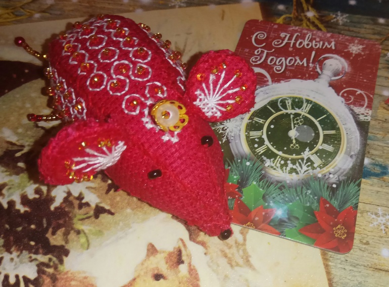 Мышка из канвы красной. Сначала вышивается, бисером расшивается, потом вырезаешь и детали и сшиваешь мышь по инструкции. Хорошо, что она есть, а то с моим отношением на ВЫ к шитью...могло бы и не получится)