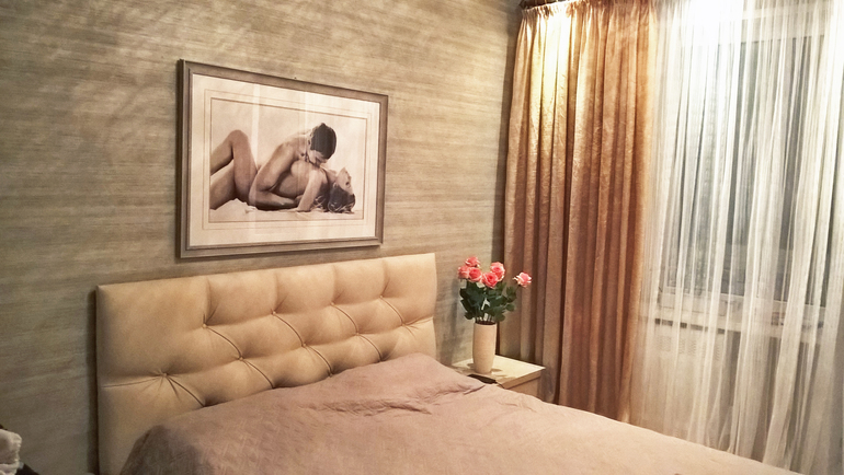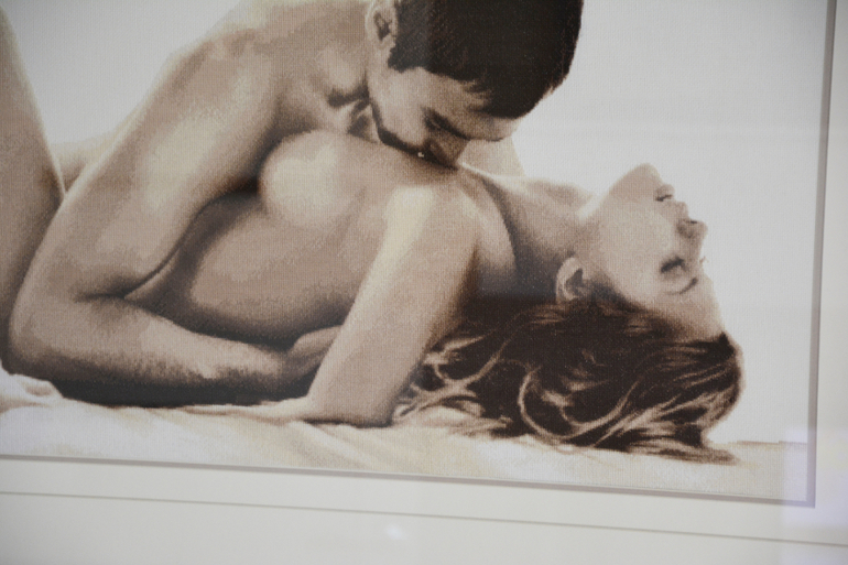 Вышита для оформления спальни по заказу мужа. Картинка -оригинал многократно фотошопилась, в процессе чего мужчина был раздет, а дама приобрела роскошные локоны от другой барышни:) Короче "гремучая" смесь этих картинок: