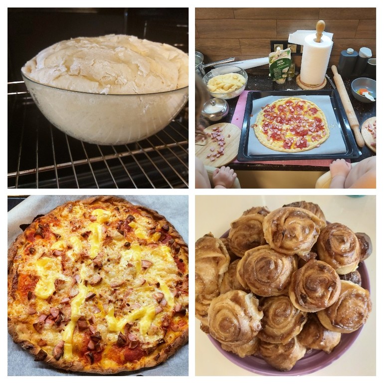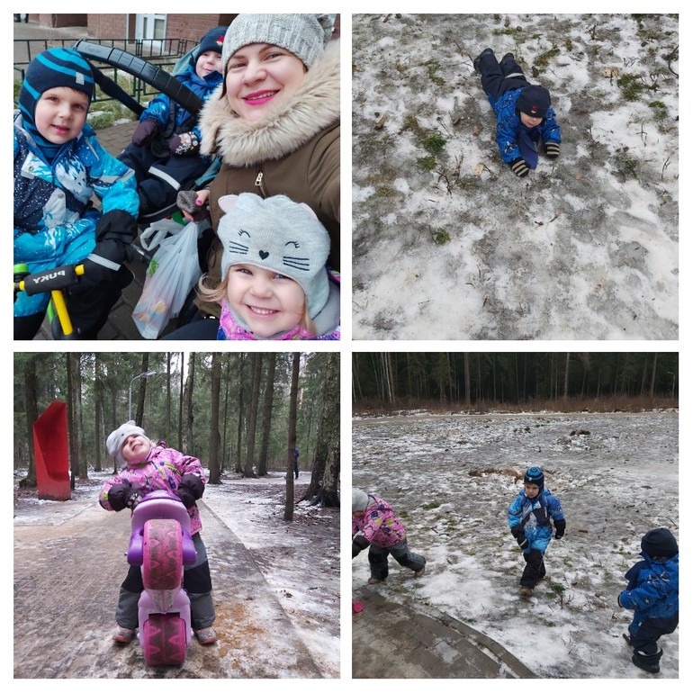 В выходные была непонятная погода около 0, но дети успели поколотить лед и попадать с него. В воскресенье я приготовила домашнее тесто (потому что в магазинном из дикси, что принесла свекровь, ужасный состав, пальмовое масло и много ешек, кто не в курсе, это вредные пищевые добавки))). В итоге сделала большую порцию и мы пекли несколько пицц и булочки с вареньем, дети многое сами делали. Потом все это кушали. У меня все закончилось смектой )))