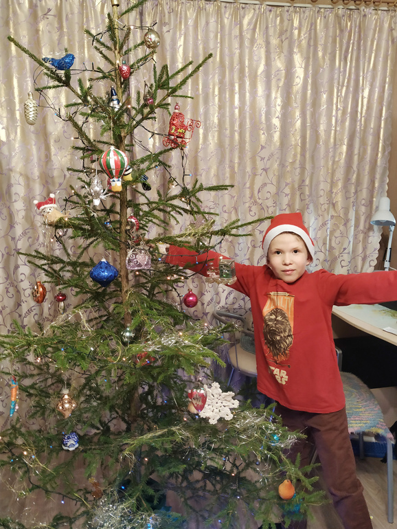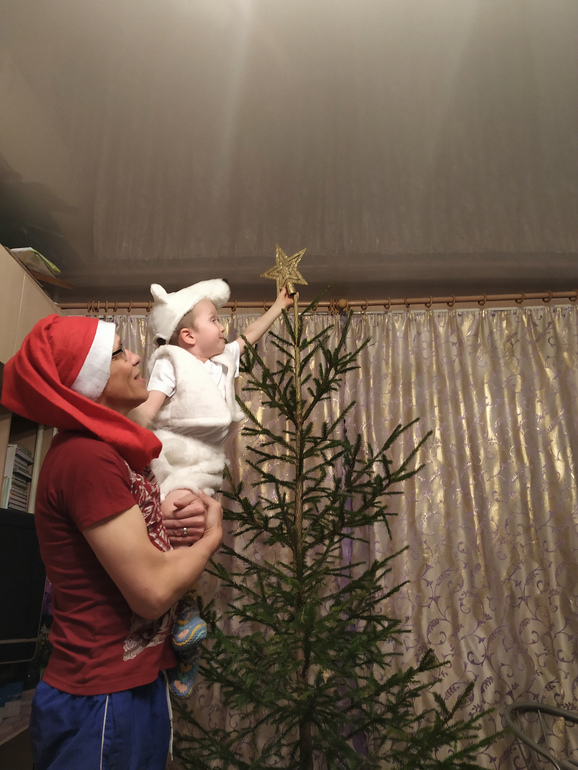 А в субботу папуся привез нам из лесу ёлочку! Ёлочка не влезла и отпилили от неё метр (чуток снизу, чуток сверху), да перестарались, в этом году она у нас не до самого потолка... Звезду водружал младшенький)