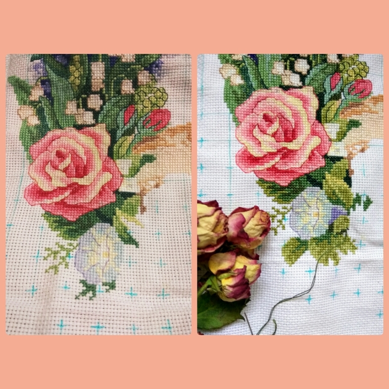 Младший сынок проболел все нг праздники, обструктивный бронхит. Лечились дома, но пакеты в больницу до сих у порога стоят не разобраные, т к. было подозрение что бронхопневмания. Сейчас гораздо легче, но кашель ещё есть. Долечиваемся. За все это время за вышивку даже не бралась, достала на этой неделе только свой долгострой. Было /стало результат за 3 вечера