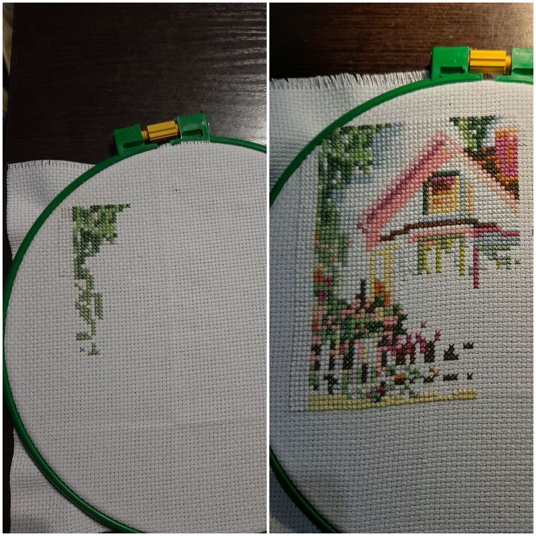 Домик продолжаю вышивать. Получается какая то ерунда на мой взгляд, но чего хотеть от дешевого китайского наборчика😂 есть только схема с кучой цветов, а ключа к ней нет. Вышиваю по цветоощущению как могу😂😂😂 не судите строго