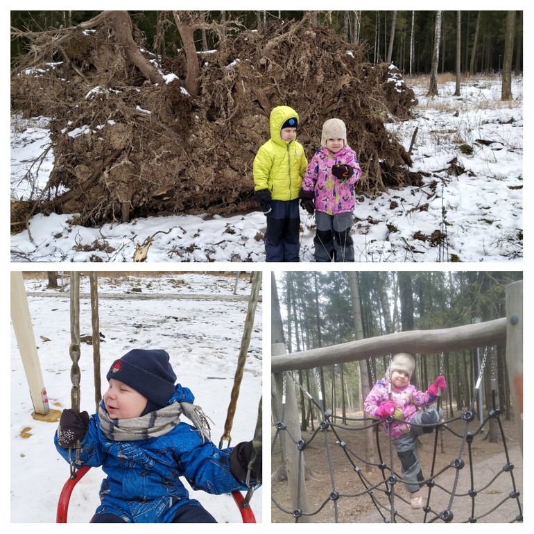 Неделя началась хорошо, ходила гулять с детками, у нас еще снег лежал, мы рассматривали корни деревьев, которые повалило во время урагана. (Фотка справа внизу сделана в эти выходные, снег растаял, но на улице все еще холодно, дочка в зимней одежде гуляла)