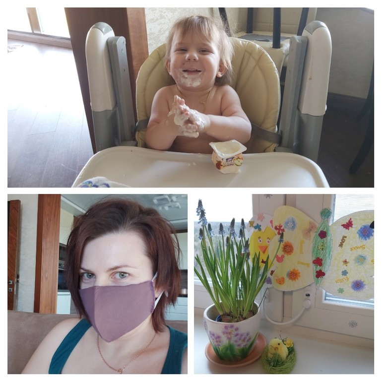 Также я купила себе в продуктовом цветочки (единственные, которые были), чтобы радовали меня. И еще сшила добротную маску с фильтрами из марли.