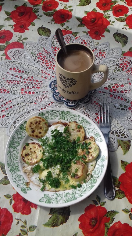 Расскажу про мой(и наш с Ленкой) любимый "Завтрак по-Владыкински", любимый завтрак в Усадьбе. Это кругляш(и) кабачка, поджареный на сковородке, залитый яйцом и щедро посыпанный зеленушкой, только что собранной с грядки(а, под конец лета и кабачок тоже с грядки))) И, конечно, кофе с молоком!