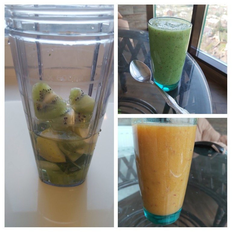 И блендер для смузи тоже радует меня очень. Один прием пищи спокойно может заменить такой вот сытный смузи из сельдерея,зеленого яблока, киви и огурца. Вряд ли можно сьестьэти овощи и фрукты просто так в один прием и сказать "я сыт и счастлив", а вот в виде смузи пьется/кушается легко, а в желудке (мозгах) - приятное ощущение сытости.