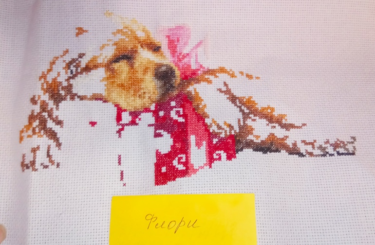 40 задание - вышить квадрат 20 на 20. Вышивала щенка. 20 на 20 - это где нос