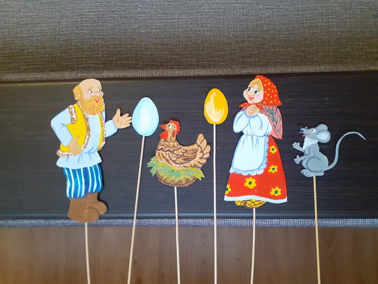 . На этой неделе у детей продолжалась тема "В гостях у сказки ". Мы читали книги . А в группе дочки воспитатели попросили снять видео ,как она рассказывает сказку "Курочка ряба " . Я ночью нарисовала героев ,на следующий день приклеила их к шпажкам и у нас получился кукольный театр
