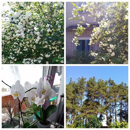 Тут такая красота, тишина, птички чирикают ) Я даже немного фотографий вам принесла ) Это у мамы во дворе цветет жасмин, запах - на весь двор! И сосны в небеса! А дома зацвела орхидея, тоже так красиво )