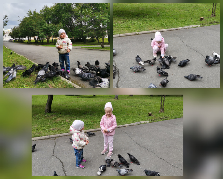 На днях гуляли в парке, решили голубей покормить.. Они, видимо, оголодали.. Куча прилетела, я столько сразу не видела. Девочки в восторге были!