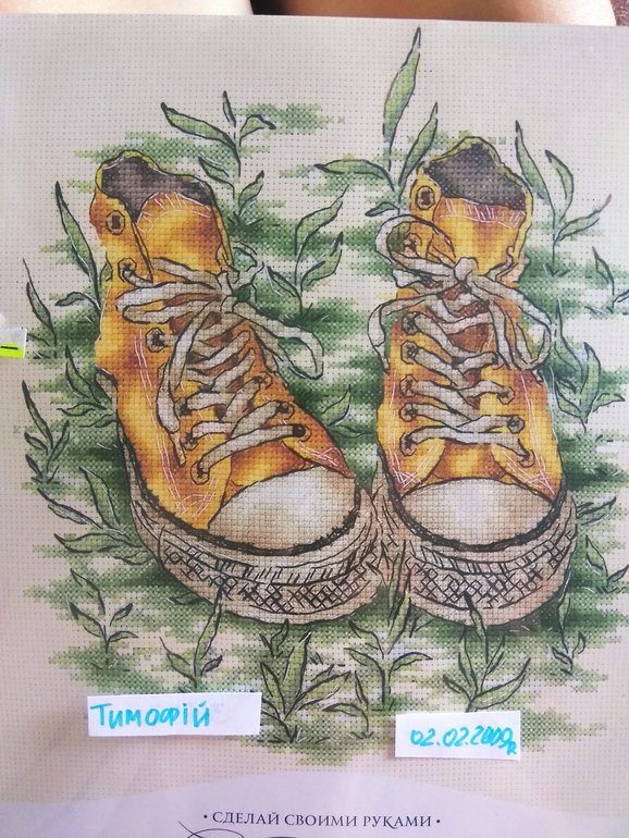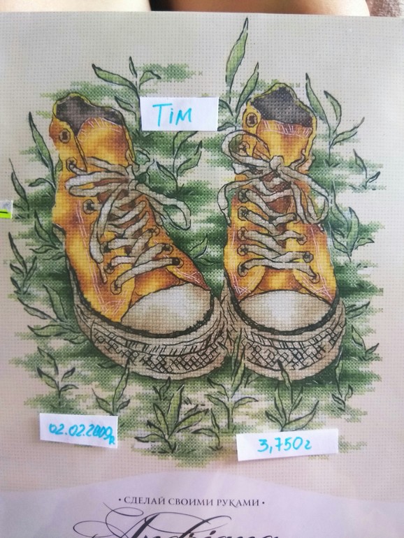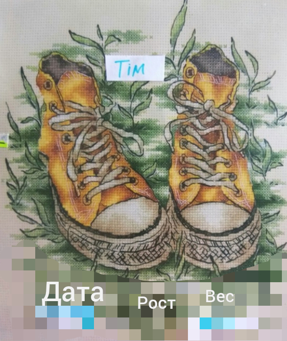 Хочу начать кеды для сына. Но я же изначально увидела в них метрику. Вот и думаю, куда пристроить имя, дату, вес. Внизу и вверху самой вышивки места не будет, канвы там впритык. Как лучше, что думаете?