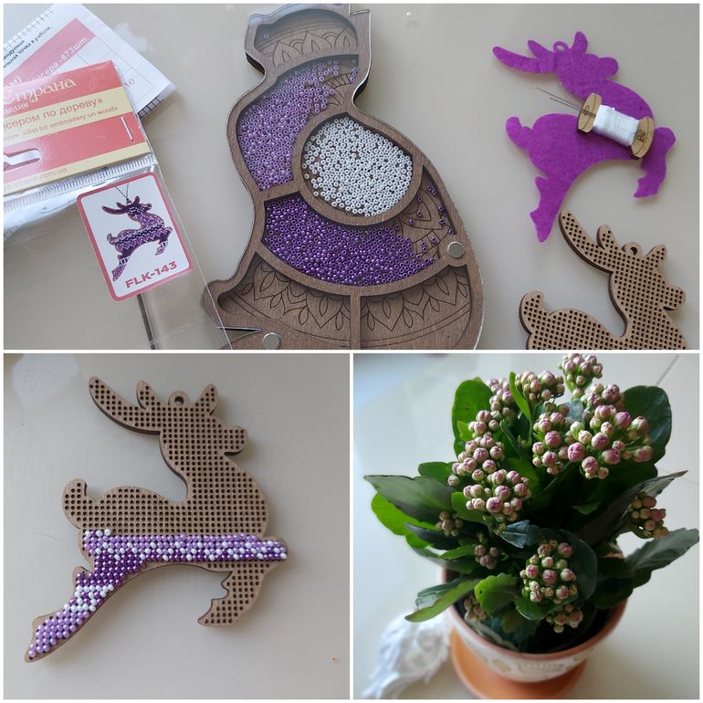 Специально для вышивки игрушек я приобрела органайзер для бисера, очень удобный, накрыл крышкой и не страшно, что бусины рассыпятся. А цветочек я себе купила для настроениЯ. У меня нет домашних цветов, по разным причинам, а вот такие цветущие (на один раз) я люблю - для цвета и настроениЯ. Будет меня радовать цветением, пока я вышиваю за столом)).