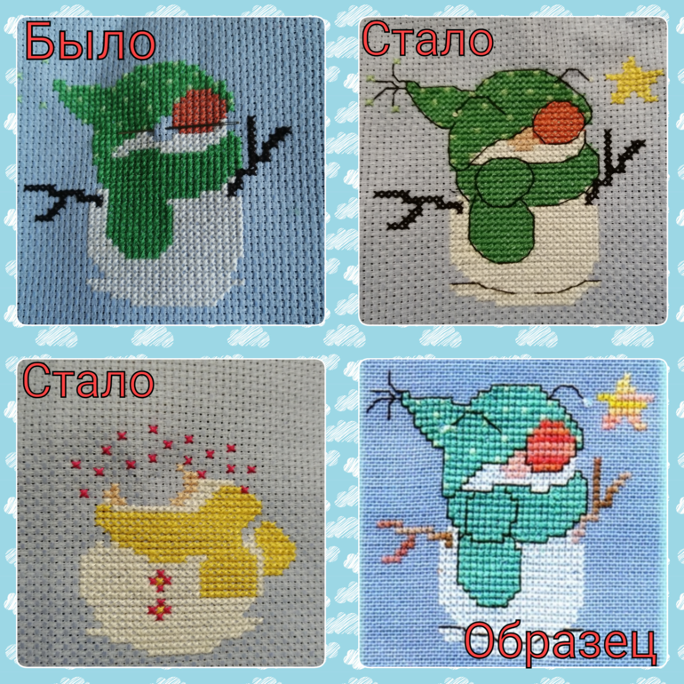 У меня вот тоже 2 снеговичка в зелёном. Решила второго не вышивать, тем более что я его уже вышивала, только на белой канве, он у меня уже где-то в ёлочных игрушках лежит.