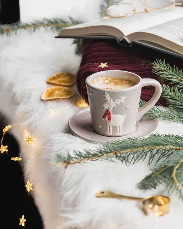 Уютная книга, пледик, камин, чашечка горячего шоколада (глинтвейна, кофе, чая...)