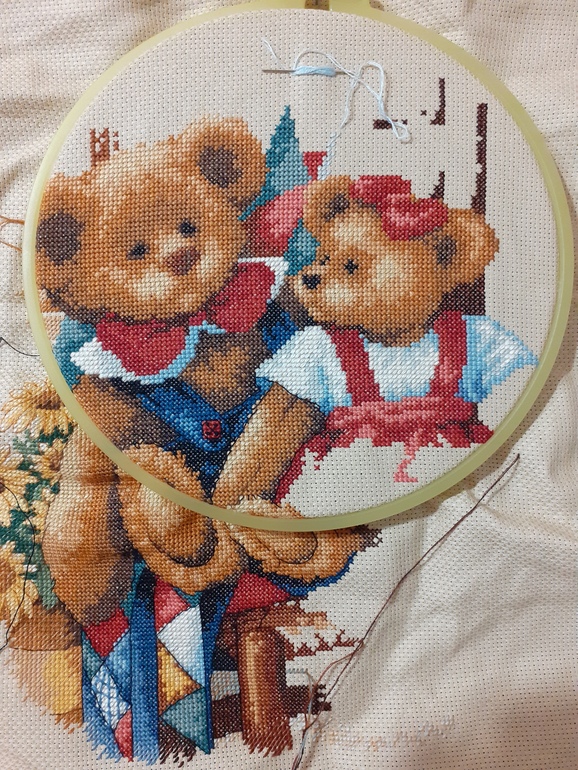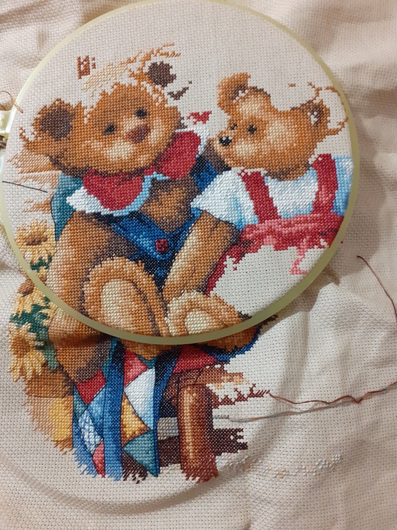 С бабушкой на этой неделе поссорились:) только прическу немного серым дошила и хотела сразу глаза вышить, но запуталась в жутких четвертушках на своей 16 канве и всё распорола, буду сначала кожу вышивать