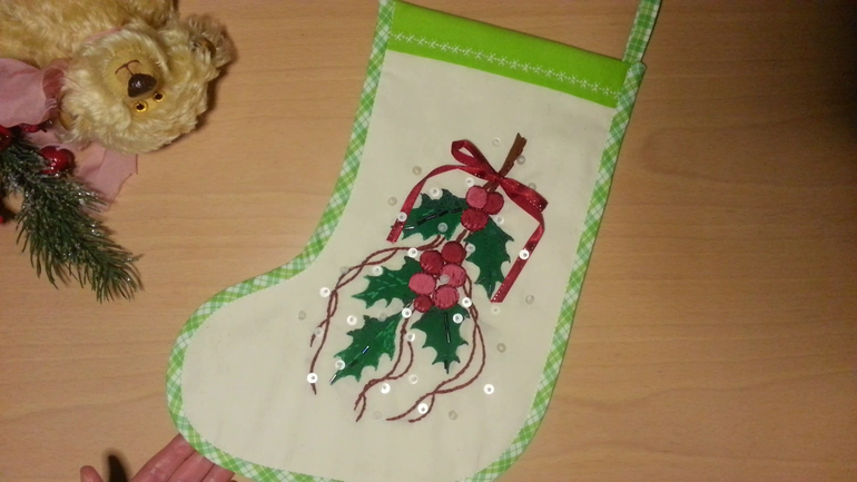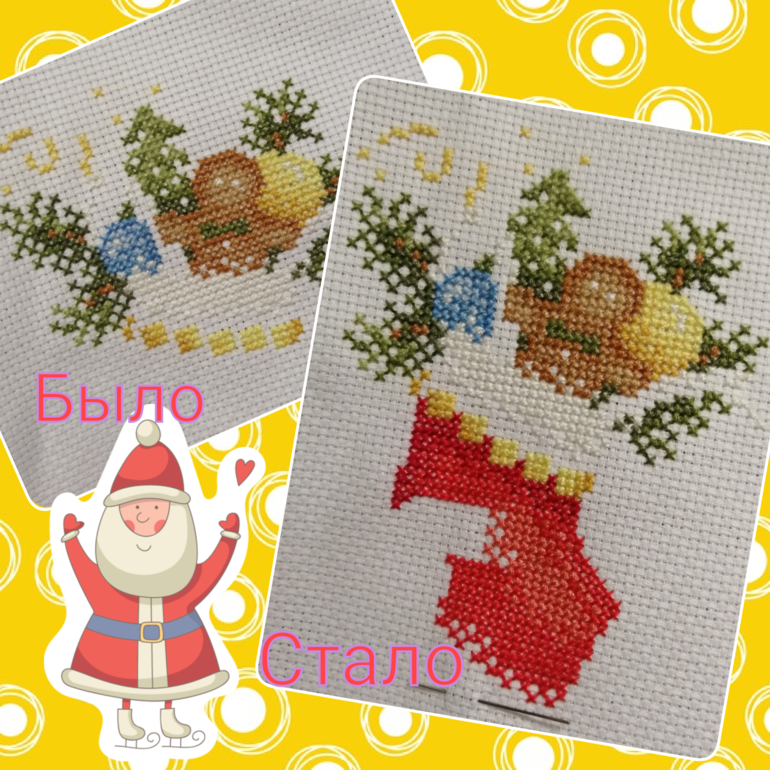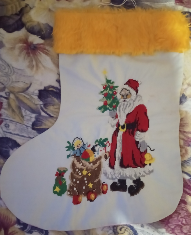 Забыла, что обещала Оле показать свой первый носок новогодний, он же вообще моя первая вышивка:) 26 лет старичку :) первой дочке вышивала, когда беременная ходила.