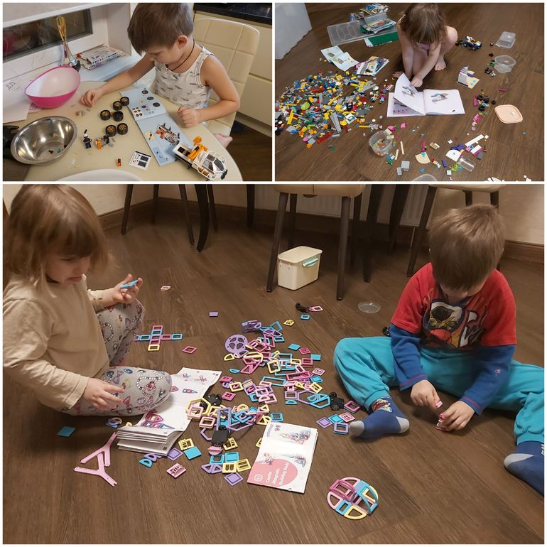 Решили в пятницу детей в сад не водить, и завтра тоже. Самые морозные дни отсидеться дома. Сидим каждый день сортируем смешанные в кучу наборы лего и строим..также подруга подарила детям магнитный кончтруктор, китайский, но на удивление магниты держат хорошо, а самое главное, так много деталек, что хватает всем троим, чтобы строить одновременно.