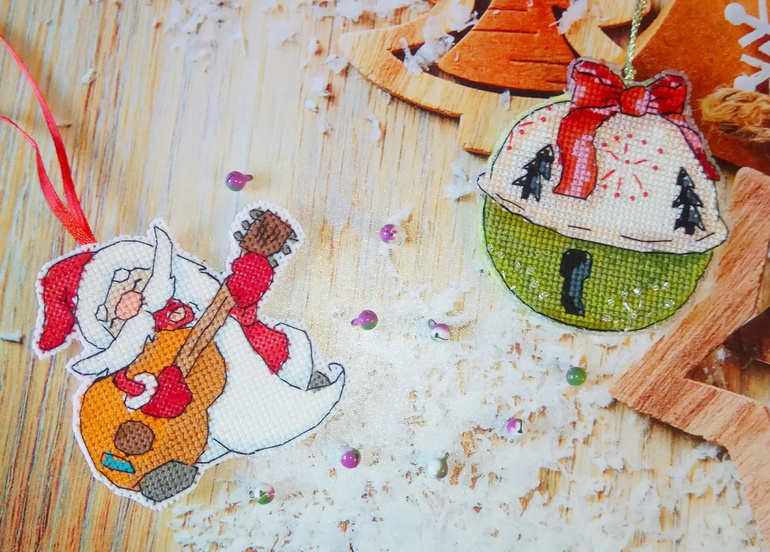 И ещё вышились две малютки. По авторским схемам. Дед Морозик с гитарой, дано тоже планировала. Старший сынок у меня всегда с гитарой тоже) И бубенчик, схему которого выиграла в квест-игре. Немного добавила металлика и вместо фрузелков бисер