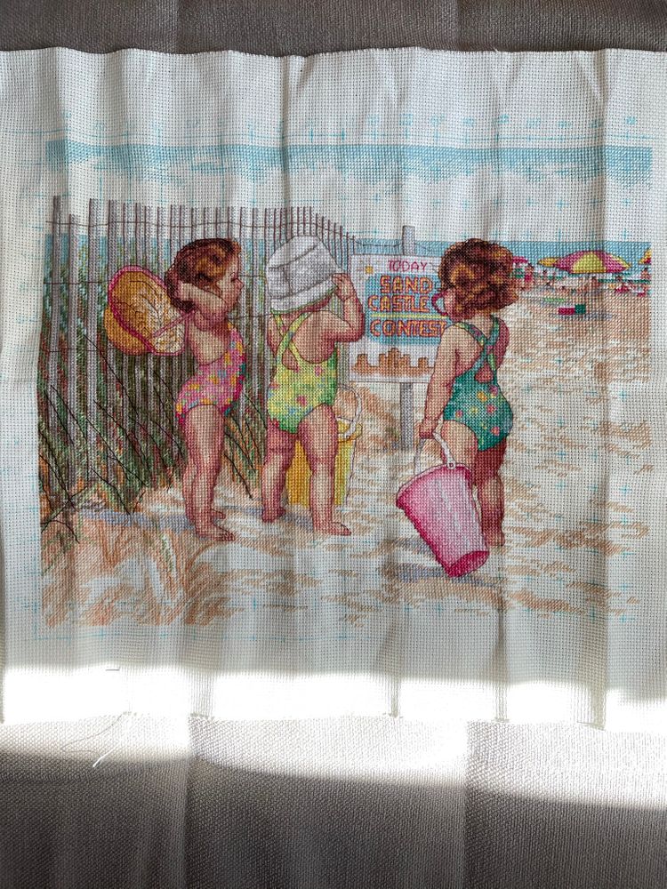 По вышивке хорошо повышивала, хотя и времени мало было. Вышила двух девочек и темную траву. Сейчас осталась только траву добить, но прямо трудно, так как полосочек много, они у меня все сливаются...
