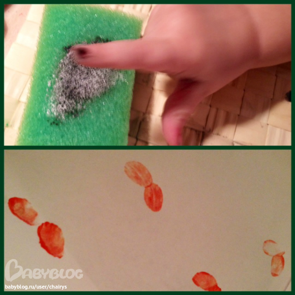 Самое главное, это мокать пальчик не непосредственно в краску, а прикладывать к губке с краской:) Тогда отпечаток на листе бумаги будет четче и аккуратнее:)