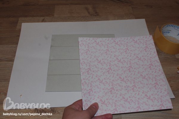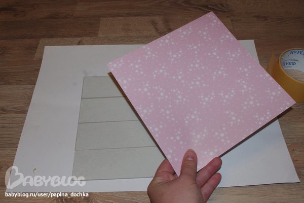 4. Затем очень аккуратно наклеиваем цветную бумагу на скотч. Сначала обрабатываем одну сторону картона, и только затем - вторую.