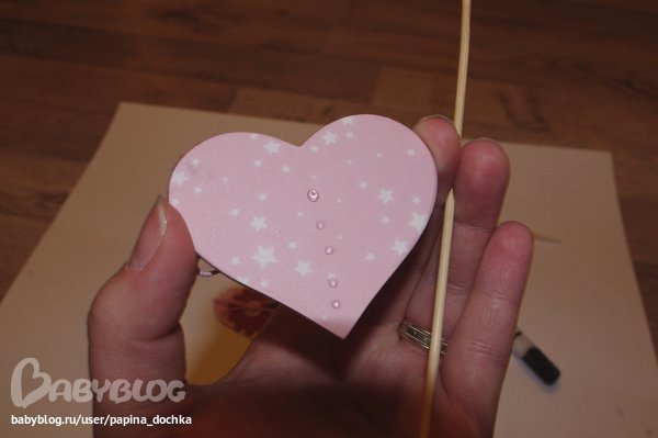 10. далее нам нужно закрепить наши украшенные заготовки на палочки. для этого на обратную сторону нанесём несколько капель клея-геля и на 8-10 секунд прижмём палочку к заготовке. Ни в коем случае не давайте детям вдыхать пары клея, помогите им на этом этапе работы.