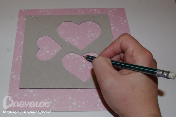 Далее нам необходимо вырезать фигурки. У меня была заготовка с сердечками (трафарет). Посмотрите, что есть у вас дома ) заготовкой может быть даже обычная чашка. которую вы можете приложить и обвести дно по контуру карандашом. Или какой-то другой предмет ) включите свою фантазию )