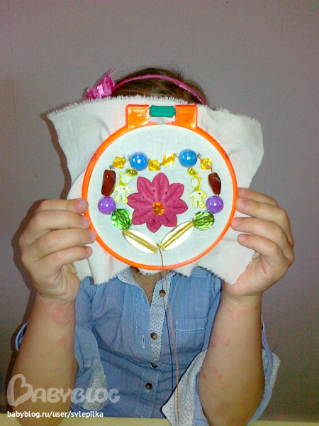 В серединку мы пришили декоративный элемент (из холодного фарфора, пробник), а по бокам мишки (это были серьги), по принципу бисероплетения сделали висюльки. И особо не видно, показала, как делать бахрому, на Х/Б отлично получается. Все закрепки и начальные элементы естественно взрослый делает, в данном случае цель показать принцип движения иглы, не путать лицо/изнанку. Тоже не маловажно пяльцы не вертеть верх низ, и следить, чтобы левая рука держала пяльцы – правая работала иглой, чтобы во время работы не путались руки, у каждой руки свое задание.