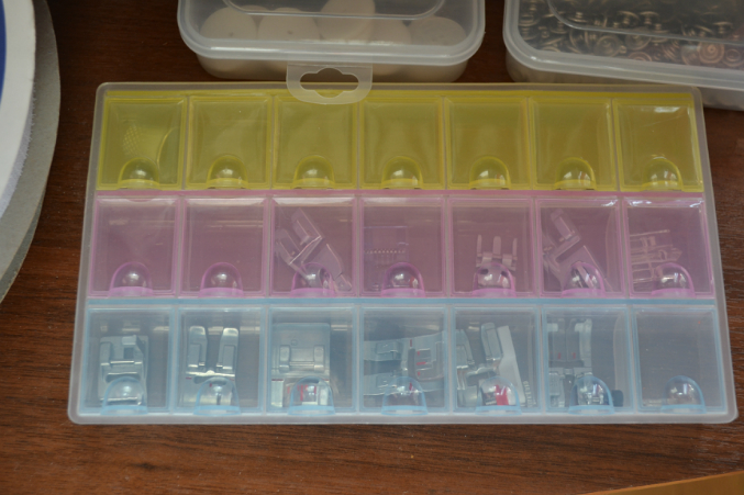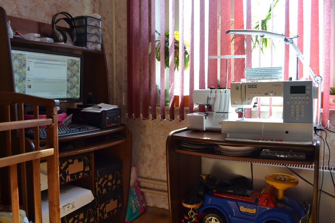 Швейная машинка и оверлок стоят на бывшем компьютерном столе. У стола удобно выдвигается полка, где я храню лапки, кнопки, пуговицы и ниаболее востребованную липучку.
