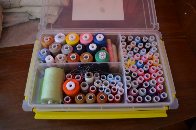 Слева стоит компьютер. Под ним коробки с вышивальными и оверлочными нитками.