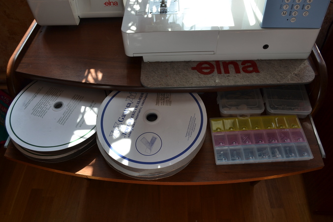 Справа от вышивалки стоит бывший пеленальный комод. Его использую как рабочуюю поверхность (заправить пяльца, что-нибудь отрезать и т.д.)
