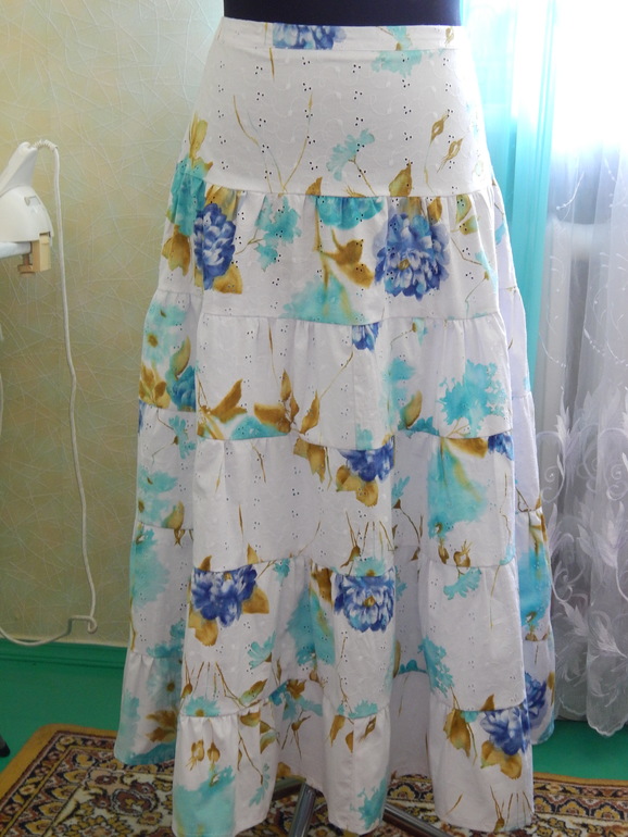 Хорошая юбочка. Расцветка приятная. Но будь она однотонного цвета было бы лучше. Просто, потому что рисунок крупный и видно, что ярусы не попадают друг в друга, рисунок "ломается". Это не есть хорошо)) а в целом юбочка милая))