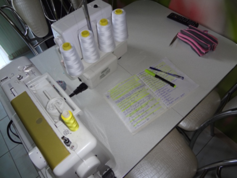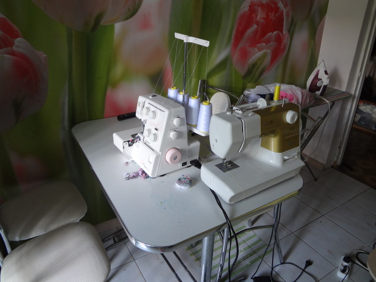 мой стол,на нем машинка и оверлок,после окончания я всё убираю с кухонный ящик,где ткани вниз(фото позже).