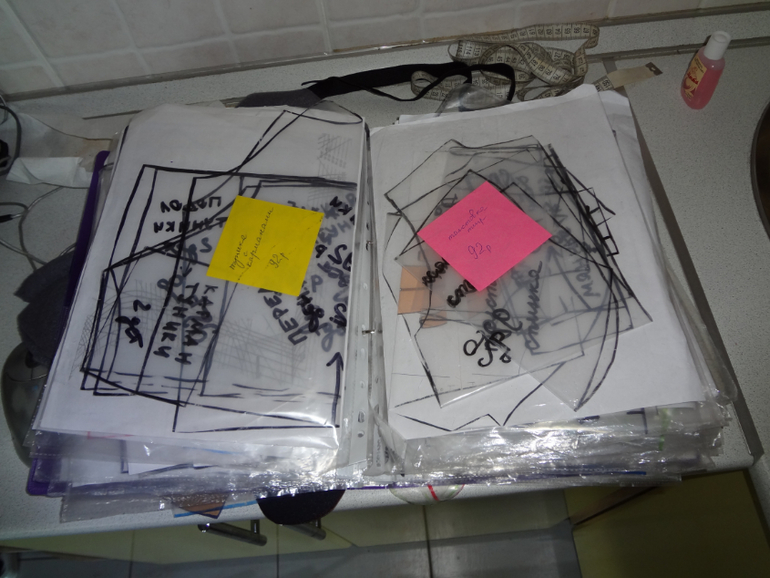 Видны мои красочки по ткани наверху,их уже набралось прилично))))На фотке ниже мои выкройки,они расфасованы по файлам в папке,всё подписано.