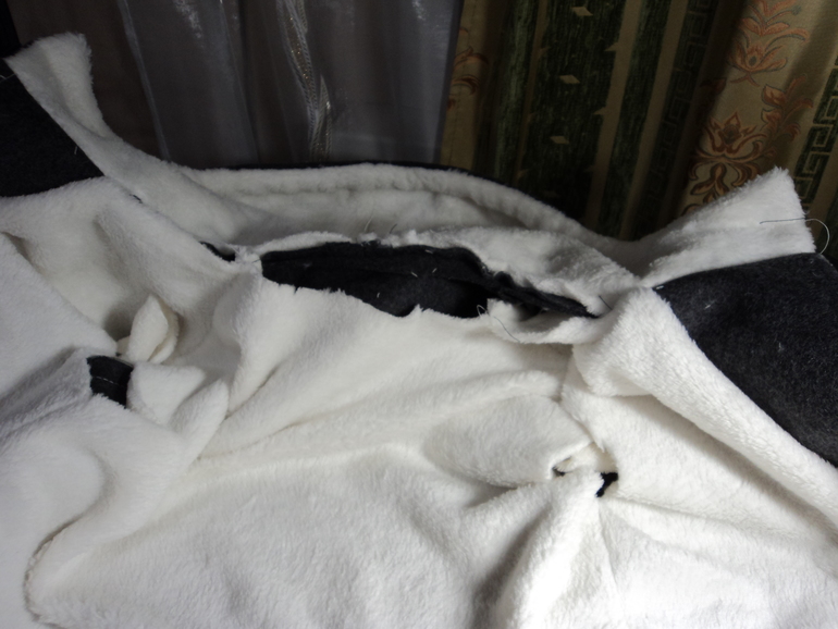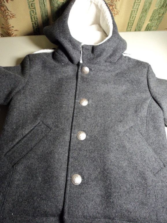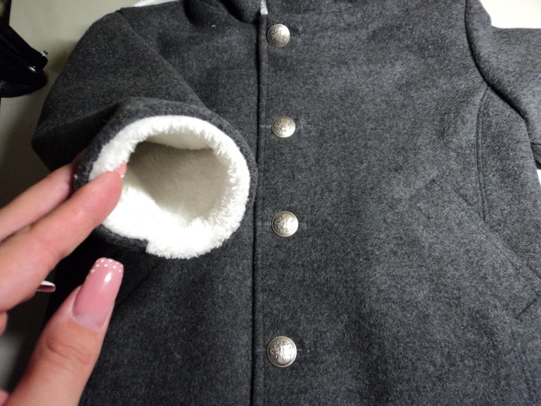 На подкладку использовала флис-махра, хотя ничего общего с флисом я не нашла, скорее с одной стороны это мех, а с другой стороны мохра. Карманы в листочку, капюшон впереди на потайной кнопке. ,Себестоимость вышла в районе 550 рублей.